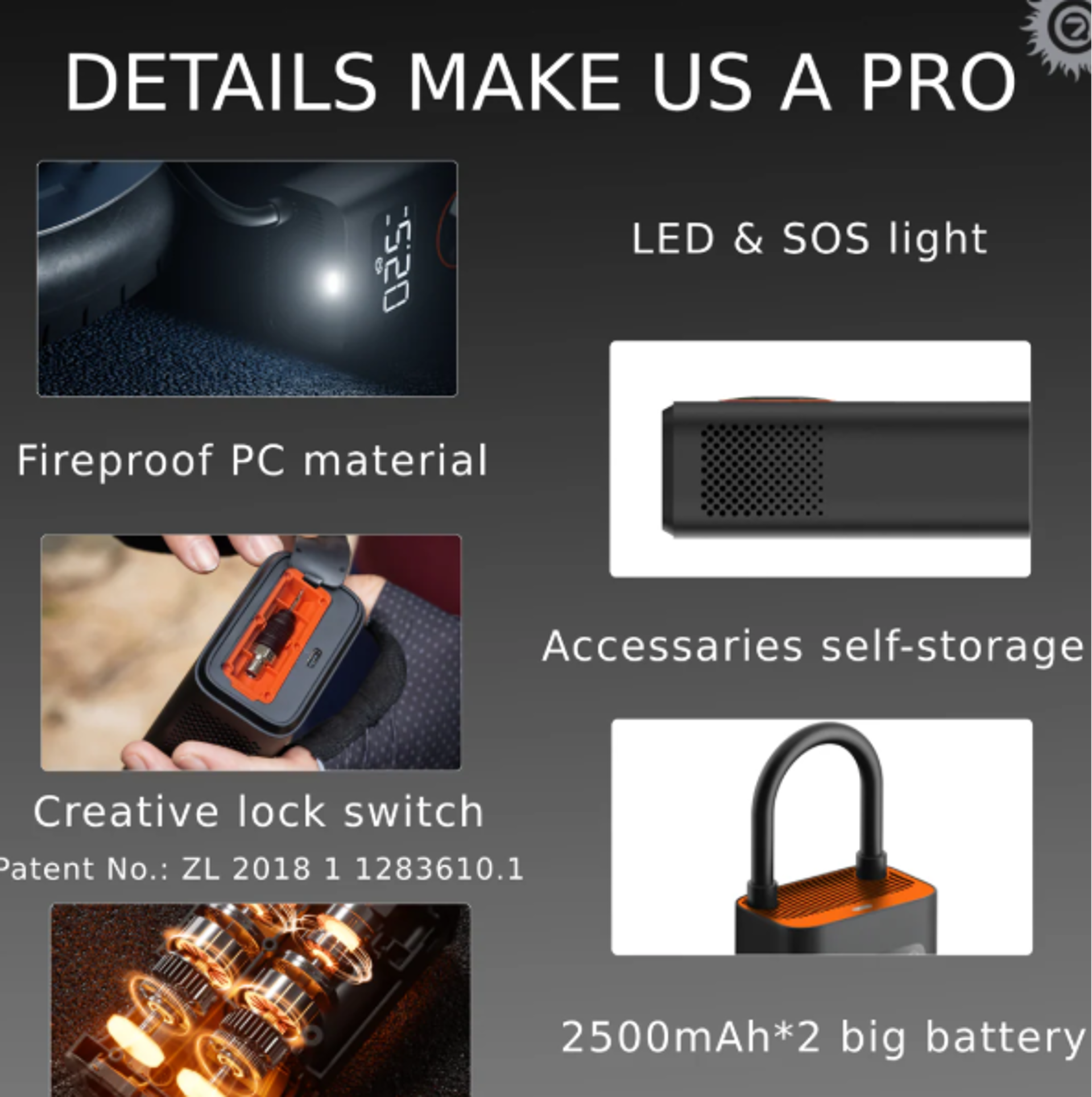 • Powerful capacity: Up to 150 PSI with a 7.4 V (2.5 Ah) rechargeable battery